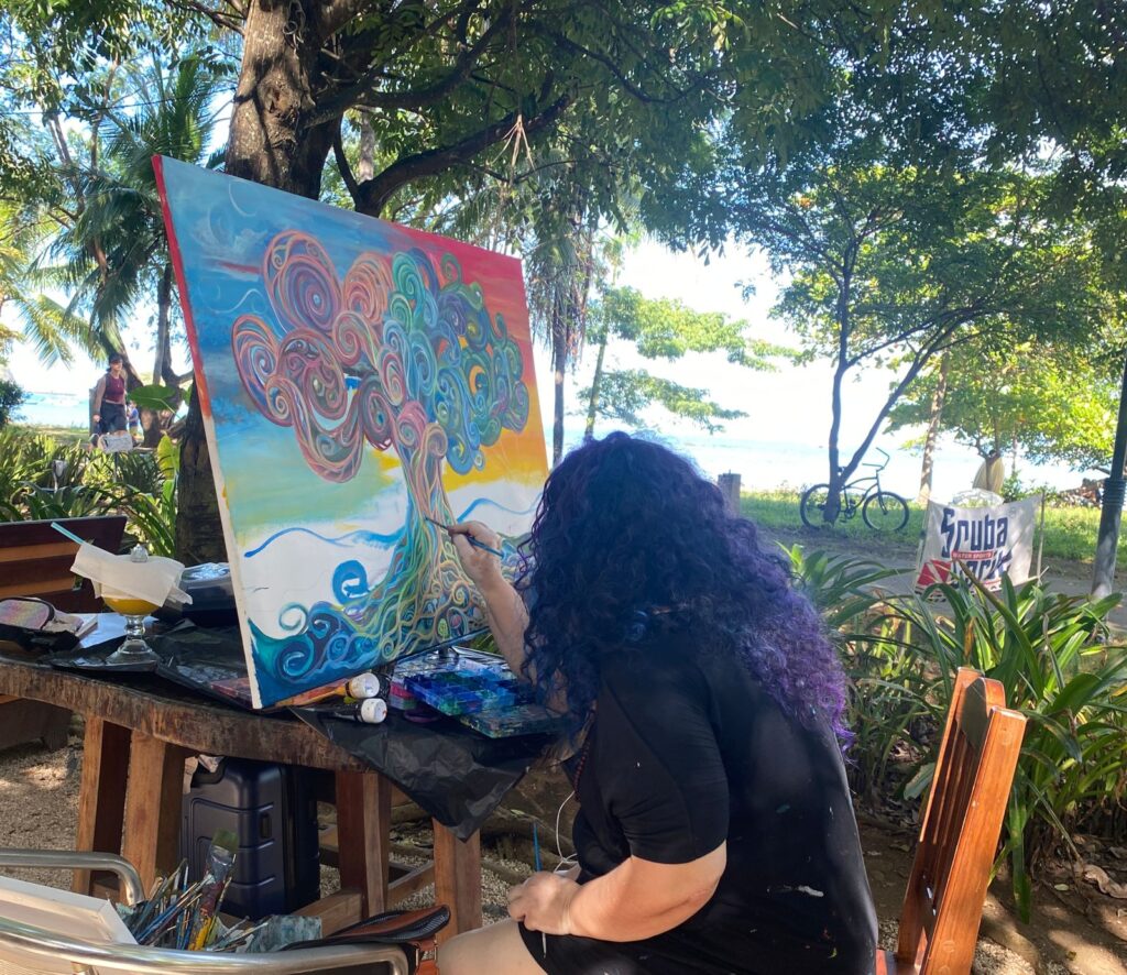 Her artistry is not simply observed but experienced, as she transforms blank canvases into vibrant depictions of Costa Rican life and landscapes.